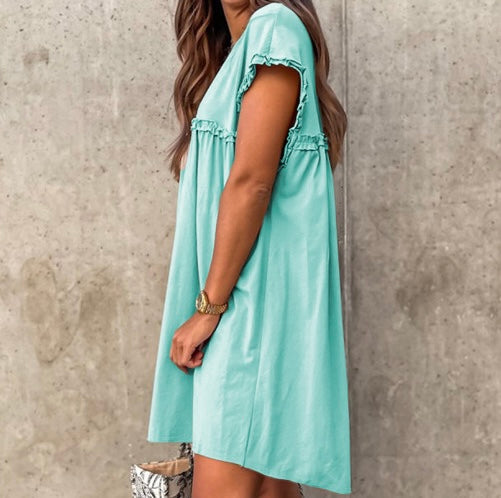 Frilled Trim Crew Neck Loose Fit Mini Dress