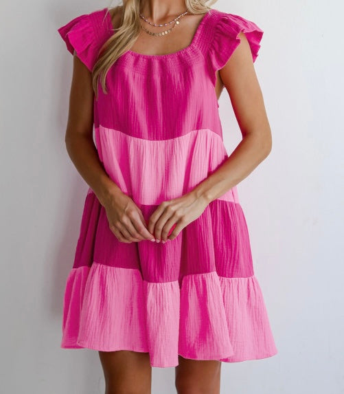 Crinkled Colorblock Patchwork Flutter Tiered Mini Dress