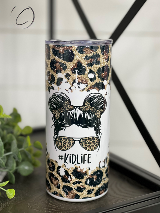 Leopard Messy Bun #Kidlife 15oz Kids Skinny Tumbler