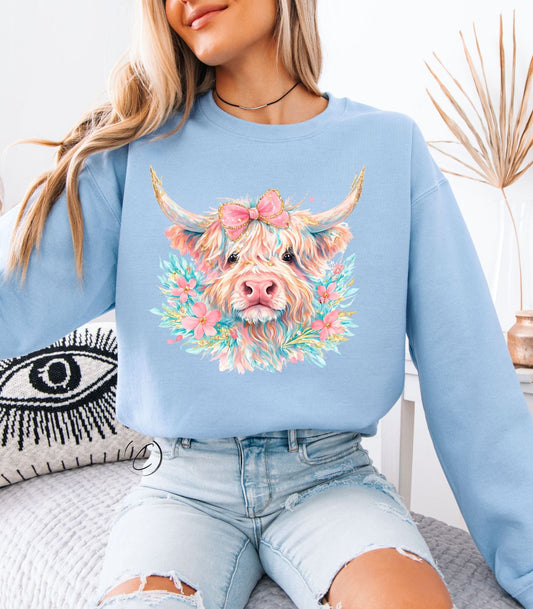 Watercolor Spring Highland Cow Sweatshirt