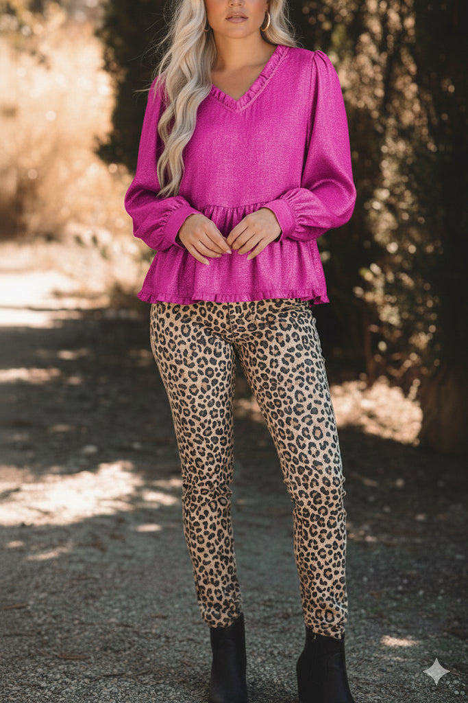 Metallic Frilled V Neck Puff Sleeve Babydoll Blouse